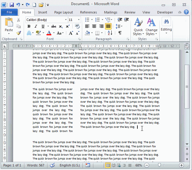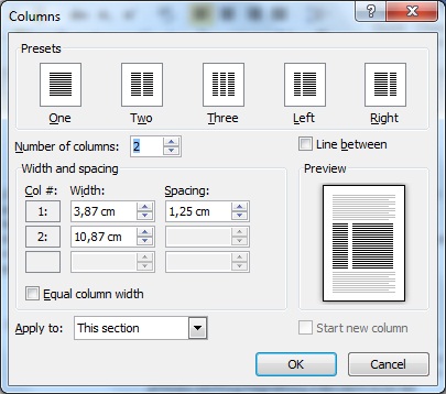 WORD omogućuje izbor širine kolona iz COLUMNS dijalog prozora /COLUMNS DIALOG BOX/. Iz PAGE LAYOUT TAB, PAGE SETUP grupa, COLUMNS dugme, MORE COLUMNS opcija. Izabrati parametre. Sa EQUAL COLUMN WIDTH prekidač /CHECK BOX/.