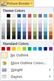 U WORD-u je moguće dodavanje okvira slici. Iz FORMAT TAB izabrati PICTURE STYLES grupa, PICTURE BORDER dugme Slika 1. PICTURE BORDER galerija