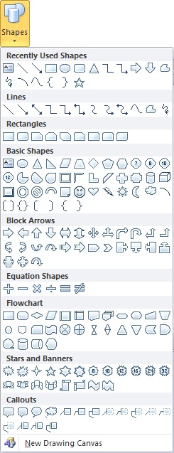 INSERT TAB, u ILLUSTRATIONS grupi, SHAPES dugme , izabrati oblik. Kliknuti na dukument i metodom DRAG & DROP nacrtati oblik.