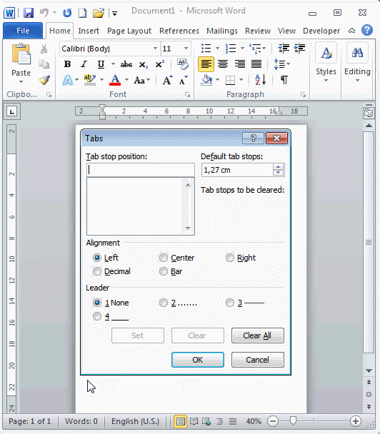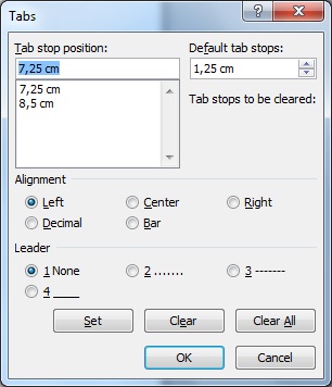 Slika 1. TAB STOP dijalog prozor.