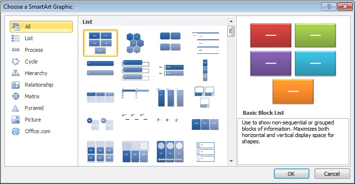 Slika 1. SMARTART - CHOOSE SMARTART GRAPHIC dijalog prozor /CHOOSE SMARTART GRAPHIC DIALOG BOX/