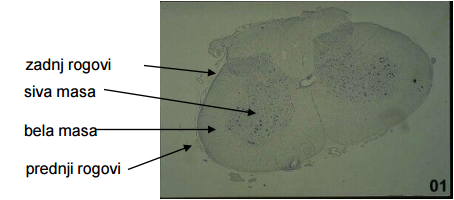-Na poprečnom presjeku razlikuje se bijela i siva masa te prednji i zadnji rogovi