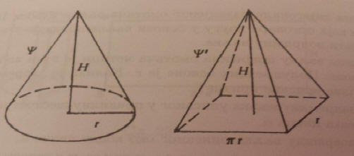zaključujemo da kupa K i prizma K1 imaju jednake zapremine, te je V(K) = 1/3