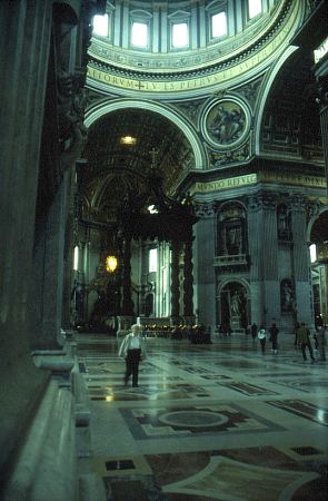 vjerovatno naj- ljepsa crkva na svijetu. Podignuta je na mjestu gdje je stajala jedna od najstarijih gradskih crkava, Konstantinova, sagradjena jos u 4. vijeku n.e. Prvobitni plan izgradnje djelo je Bramantea, ali je ovaj plan modifikovao Mikelandjelo. Pocetkom 17. vijeka Maderno je nastavio posao, rukovodeci se licnim zeljama pape, a rad je zavrsen 1657. godine kada je Bernini sagradio poznate Kolonade koje okruzuju trg. Na trgu se nalaze i dvije fontane, jedna je djelo Maderna a druga Berninija. Pretpostavlja se da se u crkvi cuvaju posmrtni ostaci svih papa, kao i samog Svetog Petra. Ovdje se nalazi i poznato Mikelandjelovo djelo "Pijeta" koja je danas, poslije jednog atentata, iza neprobojnog stakla, kao i "Prijesto Svetog Petra", mastoviti rad Berninija. Centralni dio zauzima velicanstvena Mikelandjelova kupola. Turisti s tolikim divljenjem obilaze ovu crkvu jednostavno nemajuci vremena za ostale znamenitosti Rima. |