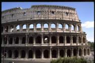 Koloseum- fantastični stadion koji se nalazi u blizini Foruma, danas najpoznatiji simbol antičkog Rima i vjerovatno najpoznatiji rimski spomenik na svijetu. Njegovo pravo ime je Flavijev amfiteatar zato što je radove na njemu otpočeo Vespazijan iz porodice Flavijevaca, 72 god. n.e., a radove je završio njegov sin Titus, osam godina kasnije. Ime Koloseum dobio je jer se isprednjega nalazila kolosalna statua Nerona. Čak 50.000. ljudi ovdje je moglo da uživa u borbama gladijatora, ali i imitacijama pomorskih bitaka (ubacila bi se voda u središnji dio), kao i lovu. |