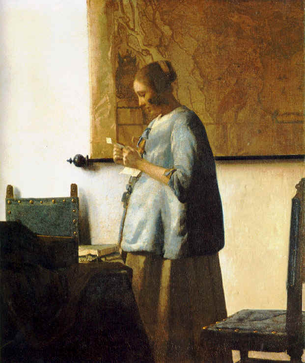 1662-1665 (Kraljevski muzej, Amsterdam). Citanje i pisanje cesto su prikazivani na Vermerovim slikama i pojacavaju utisak tajanstvene tisine koja kao da obliva njegove modele.Poznata karta opet se pojavljuje na ovoj slici zene koja cita. |