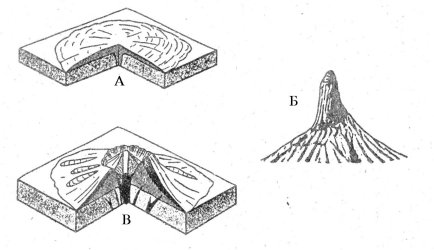 sl.8. Neki tipovi vulkana: A - havajski, B - pelaški, V - vezuvski