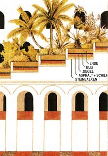 Diodor von Sizilien vergleicht in seiner Beschreibung der Haengenden Gaerten die Kellerkonstrukton mit den Roehren einer Hirtenfloete. Das von ihm genannte Mass der Gewoelbebreite stimmt ueberein. Es gab sieben Terassen Stufen von jeweils fuenf Metern, so dass die Baumkronen der obersten die Palastmaurn ueberragten. Die Mauern haetten Schutz gegen die Wuestenwinde gewaehrt, die Bepflanzung den Bueroraeumen in der Umgebung Kuehlung gespendet. Ueber den gewoelbten Kammern sollen Steinbalkenreihen gelegen haben,die eine Schicht mit Schilf durchsetztes Asphalt bedekte. Derart maechtige Baeume tragen dieses Bauwerk, dass ihre Stamme acht Ellen dick und bis zu fuenfzig Fuss hoch werden, ja sogar Fruechte tragen, als naehrte sie ihr Mutterboden.