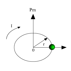 Pri kretanju po kru`noj putanji elektron (eŻ ) stvara kru`nu struju ,koja stvara sopstveno magnetno polje . Veli~ina koja karakterise mikro-magnetno polje kru`ne struje je orbitalni magnetni moment elektrona Pm koji se defini{e formulom Pm=I*S gdje je I ja~ina struje a S povr{ina strujne konture . |