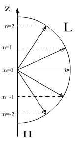 prostoru. Mehani~ki model na prethodnoj slici ja dat na osnovu klasi~ne mehanike .U kvantnoj mehanici ova pojava se ne mo`e predstaviti mehani~kim modelom.Promjena polo`aja vektora orbitalnog momenta L u prostoru se odre|uje) u odnosu na Z osu koja se postavlja u pravcu i smjeru vektora ja~ine magnetnog polja (H)>Magnetni kvantni broj m odredjuje projekciju vektora L na Z osu odnosno na pravac koji je odre|en vektorom ja~ine magnetnog polja H |
