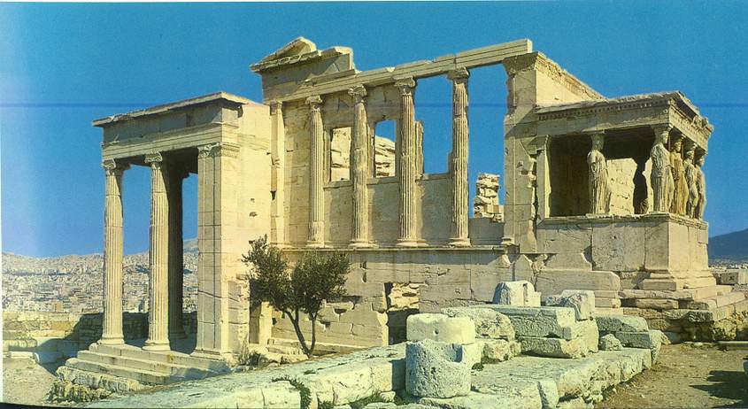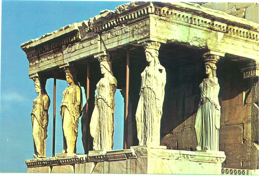 Erehteijon je karakteristican zbog svojih dostojanstvenih i velicanstvenih Karijatida,skulptura mladih svestenica ,koje svojim glavama pridrzavaju svod hrama.Erehteijon je bio hram posvecen mitskom kralju-heroju Eretheju (koji je kasnije poistovecen sa Posejdonom) .Atinjani pripovedaju da su se na tom mestu sukobili Atina i Posejdon, oko toga ko ce biti zastitnik Atine.Pobedu je odnela Atina ,ucinivsi gradu vecu uslugu,jer je omogucila da iz stene nikne dragoceno maslinovo drvo,koje je poklonila svom gradu.