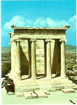 Delikatna i graciozna gradjevina sa desne strane propileja (monumentalnog ulaza Akropolja), je mali hram posvecen boginji Atini Nike, koji je poznat i kao hram "Pobednice bez krila" ,izgradjen u 5. veku p.n.e. , u cast pobede Grka nad Persijancima .Na frizu hrama isklesane su scene iz tih bitki . Ovim malim hramom Atinjani su odali postu svojoj zastitnici Atini Nike, prikazavsi je bez krila,tako da ne moze odleteti daleko od Atine.
