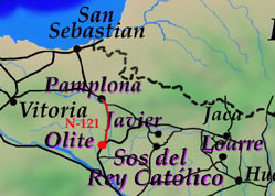 Olite je smjesten oko 30 km juzno od Pamplona. U rimskom peridu bio je vazno vojno utvrdjenje. Ojacani rimski tornjevi, i fragmentarni rimski zidovi okruzivali su stari dio grada. Prvi podaci o velikom srednjevjekovnom utvrdjenju datiraju iz X vijeka. Olite,sa visokim ,tankim i elegantnim tornjevima i kupolama je odlican primjer goticke vojne arhitekture. Tokom sudjenja, 1274. godine u zanimljivom progresuvnom cinu bio je opremljenj sa tri topa. Topovi su bili primitivni. Ovo je primjer najranije pokretne artiljerije u Evropi. |