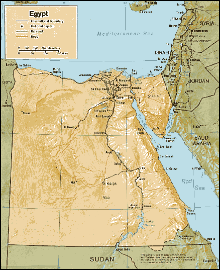 Granice: Na sjeveru je Sredozemno more, na istoku Gaza, Izrael i Crveno more; na jugu Sudan i na zapadu Libija.