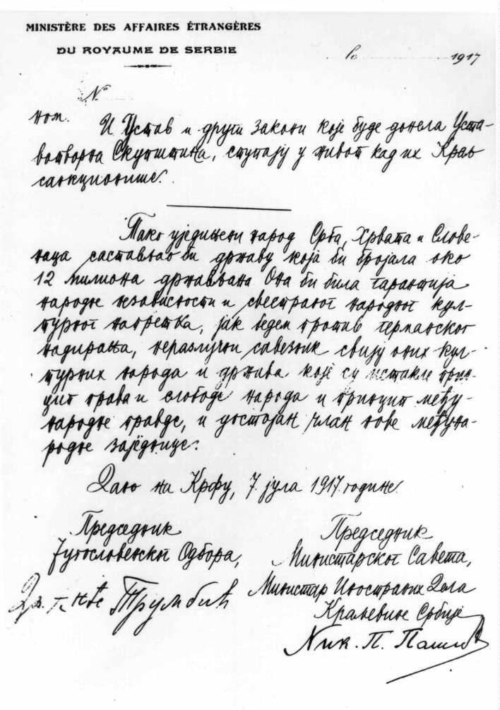 Pašić je jula 1917., potpisao poznatu "Krfsku deklaraciju" kojom se proglašava narodno i