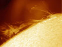 | Карактеристичне појаве на Сунцу су Сунчеве ерупције- протуберанце и еруптивне коронарне експлозије. Постоје мирне, активне и еруптивне протуберанце. Температура мирних протуберанци је 15 000К, а активних око 25 000К. Што се тиче еруптивних, оне достижу висине и до неколико милиона километара и јављају се у облику лука, након чијег пуцања материјал се враћа поново у хромосферу.Коронарне експлозије избацују у космос веома велики број наелектрисаних честица у облику Сунчевог вјетра. Када те честице доспију на Земљу оне се сударају са честицама атмосфере Земље и при том судару настаје поларна свијетлост или Aurora Borealis. |