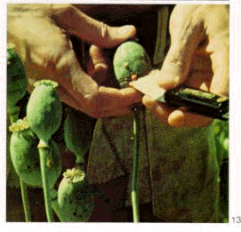 Opijum je smolasta izlučevina iz čahura bijelog maka. Ona u sebi sadrži najviše morfina, a pored njega i druge psihoaktivne supstance koje se mogu izdvojiti u čistom obliku, uključujući i kodein - lijek koji se obično koristi za ublažavanje bolova i kašlja. Pored prirodnih sastojaka ( morfina i kodeina ), iz opijuma se mogu ( preradom ) dobiti polusintetski derivati: heroin i dilaludin. Zajednički naziv ove četiri psihoaktivne supstance je opijati. Osim ovih derivata morfijuma, postoje mnogi drugi derivati, koji se dobijaju sintetskim putem i djeluju slično morfijumu, bez obzira na njihov hemijski sastav ( metadon, dipipanon i dr. ) a imaju zajednični naziv opoidi. Narkomani na našim prostorima koriste opijum u sirovom stanju tzv. "opijumske pogače". Najjače su crne pogače ( "crnjak", "marmelada", kako ih nazivaju narkomani ) koje se kuhaju iznad plamena svijeće i špicevima unose u organizam ( vene ). Pored ovog načina, opijum se zloupotrebljava gutanjem i pušenjem. Prema navodima dr. Jovana Bukelića, opijum unesen u venu ima ( obično ) tri faze dejstva: