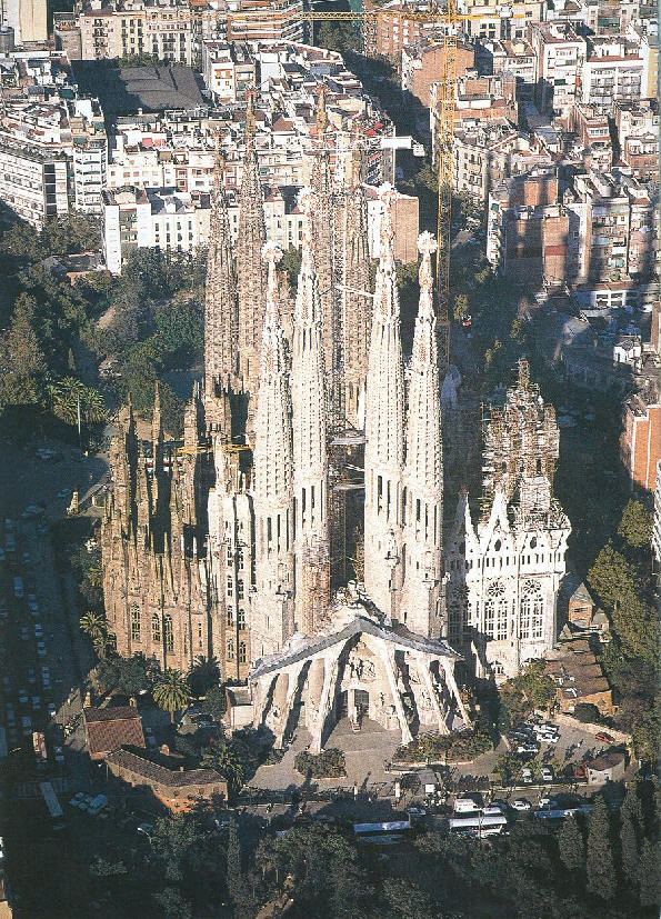 Jedan od najvećih eblema Barcelone i jedno od najposjećenijih mjesta jeste Gaudijeva SAGRADA FAMILLIA. Gaudio je počeo samostalan rad na ovom hramu 1883. godine s namjerom da to postan enajveća i najmodernija crkva u Barceloni dizajnirajući kompleksan sistem hrišćanskih simbola preko čitave konstrukcije.Projekt je podrazumjevao izgradnju centralne crkvene lađe i 4 lađe transparentne sa apsidom sa 18 velikih alegoričnih kula koje simbolišu 12 apostola, 4 evanđelista, Djevu Mariju i Isusa Hrista a sve to je trebalo da bude predstavljeno na najvišoj kuli. Vrhunci kula šiljastih vrhova su mekano uvijeni u spiralne zvjezdane oblike i u svakoj pojedinačno se nalazi krst sa obe horizontalne i vertikalne strane. Šiljsti ukrasni tornjići su veličanstveni primjeri subrealističke Gaudijeve staklene imaginacije multikolornih boja šarenih mozaika i prekrivenih spektakularnim vrhovima. Gaudijev kompletan plan i veći broj modela se mogu vidjeti u muzeju SAGRADE FAMILLIE stacioniranom ispod 4 kule na pročelju strasti.