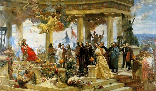 Ova slika nastala je 1896. godine. Radjena je uljem na platnu.Dimenzije su 125x222cm. Nalazi se u Zagrebu.Na slici je prikazan Ivan Gundulic, koji sjedi na stolici na terasi,kao i grupa hrvatskih reformatora predvodjenih Ljudevitom Gajem,koji mu se priblizavaju s desne strane.Gaja prate Antin Mihanovic, Ivan Mazuranic, Vatroslav Lisinski, Antin Nencic, Petar Preradovic i drugi. U desnom cosku slike su tadasnji najznacajniji hrvatski glumci: Adam Mandrovic, Marija Stroc i Josif Frodendrajh. |