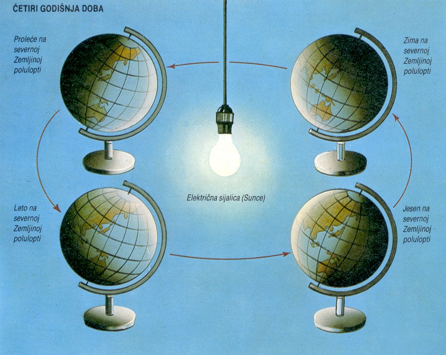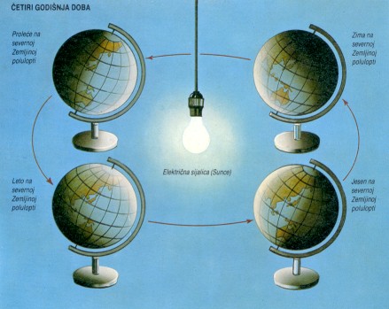 Četiri godišnja doba Postoje cetiri godisnja doba - proljece, ljeto, jesen i zima - jer osa oko koje se ZEmlja obrce ne stoji po prvim uglom na ravni Zemljine putanje. Zemljina obrtna osa nagnuta je 23,5* prema normali na ravni ekliptike. Zato seiznos zracenja koje Zemlja prima od Sunca mijenja od mjesta do mjesta i os jednog godisnjeg doba do drugog.Razumecemo zasto se javljaju razlike u godisnjim dobima ako blizu jedne sijalice stavimo globus i posmatramo kako svjetlost pada na njega. Kada se svjetlost prostire po vecoj povrsini sjeverne nego juzne polulopte globusa, to odgovara ljetu na sjevernoj polulopti. Kad svejetlost obasjava manju povrsinu na sjevernoj nego na juznoj polulopti globusa, to odgovara zimi na sjevernoj Zemljinoj polulopti. Obrnuto je na juznoj polulopti. |