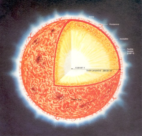 Sunce je srediste neseg Suncevog sistema koji se sastoji jos od devet planeta (od kojih je jedna Zemlja) i svih drugih nebeskih tijela koja putuju oko Sunca. Sunce je lopta usijanih gasova. Svjetli Suncev kotur (disk), koji zraci svjetlost i toplotu, zove se fotosfera. Oko fotosfere nalazi se sloj sjajnog crvenog gasa, nazvan hromosfera. Vatreno crveni plemenovi vodonika izbijaju iz hromosfere stotinama hiljada kilometara u vasionski prostor. Ovi plameni jezici nazvani su protuberance. Oko hromosfere nalazi se drugi sloj gasa nazvan korona. Na Suncevoj povrsini zapazaju se tamne mrlje, tzv. Sunceve pjege. One se mogu vidjeti kroz specijalne teleskope.