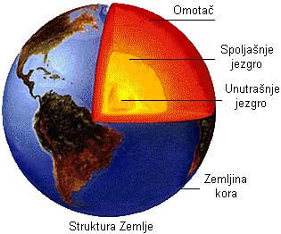 Zemljino jezgro od teških metala okružuje omotač od rastopljenog kamenja na čijoj površini se nalazi hladna Zemljina kora. Njena debljina iznosi svega nekoliko kilometara.