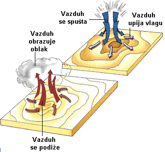 Privlačna Zemljina sila (gravitacija) privlači vazduh ka svojoj površini, pa je vazduh najgušći pri Zemljinoj površini. Pritisak Zemljine atmosfere na sva tela na Zemlji naziva se atmosferski pritisak. Hladan vazduh je gušći od toplog, pa se on spušta naniže, ka tlu, formirajući predeo niskog vazdušnog pritiska. Topao vazduh se podiže od tla i formira predeo visokog vazdušnog pritiska. Kada se vlažan, topao vazduh odigne od tla, vodena para u njemu se kondenzuje na određenoj visini i formira oblake.