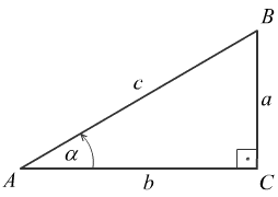 На слици 1. је фигура: правоугли троугао ABC, са истоименим страницама (мала слова абецеде) насупрот темена (велика слова) и углом алфа (мало грчко слово α ) у темену A. Дакле, наспрамна катета темену A је a, налегла катета је b, хипотенуза је c. Дефинишемо основне четири тригонометријске функције: синус, косинус, тангенс и котангенс, истог угла алфа.