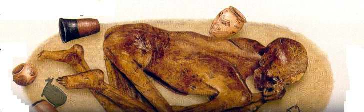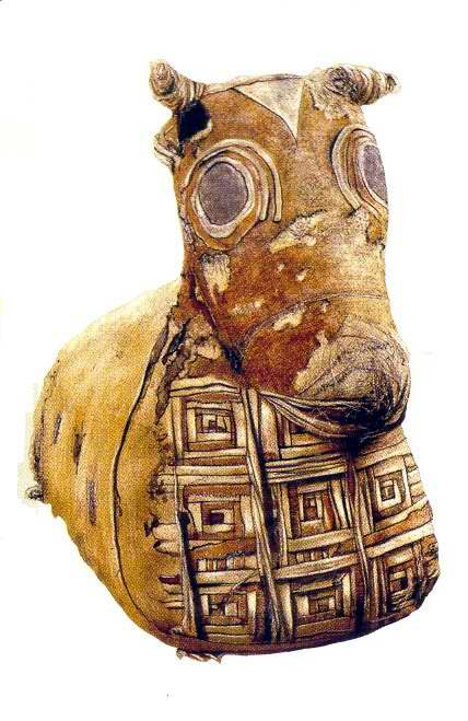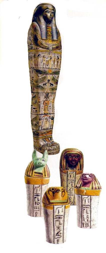 Pripremanje za zgrobni zivot Egipcani su verovali da ce, ako budu dobri u toku svog zivoa i ako postuju bogove, imati zagrobni zivot. Verovali su takodje da je vazno da sesacuva mrtvo telo, jer, ako se raspadne telo, umrli nece imati zagrobni zivot. Svestenici su izvodili ceremonije za zastitu ili "mumificiranje" tela. Prvo su odstranjivali unutrasnje organe. Potom su pokrivali telo kristalima soli, a zatim ga tako ostavljali da stoji 40 dana da se osusi. Na kraju su telo prali mirodijama, zavijali ga u carsaf i polagali ga u mrtvacki sanduk ili sarkofag Unutrasnji organi su sacuvani u odvojenim kontejneriam nazvanim kanapski cupovi. Oni su stavljani pored mrtvackog sanduak u grobnici. (gore) |