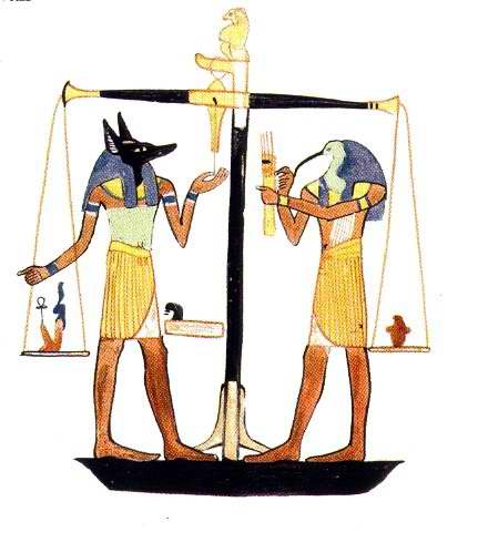 Pogrebni rituali i ceremonije Mnogi su rituali i ceremonije izvodjeni da bi se osiguralo da je telo proslo kroz podzemni svet u zagrobnom zivotu. Svestenik sa maskom Anubisa, boga mrtvih, stavlja srce umrlog na vagu sa tegom od jastuka koji predstavlja boginju Mat. Ako srce i jastuk nisu bili podjednako teski, verovalo se da umrli nije dovoljno cist za zagrobni Zivot. |