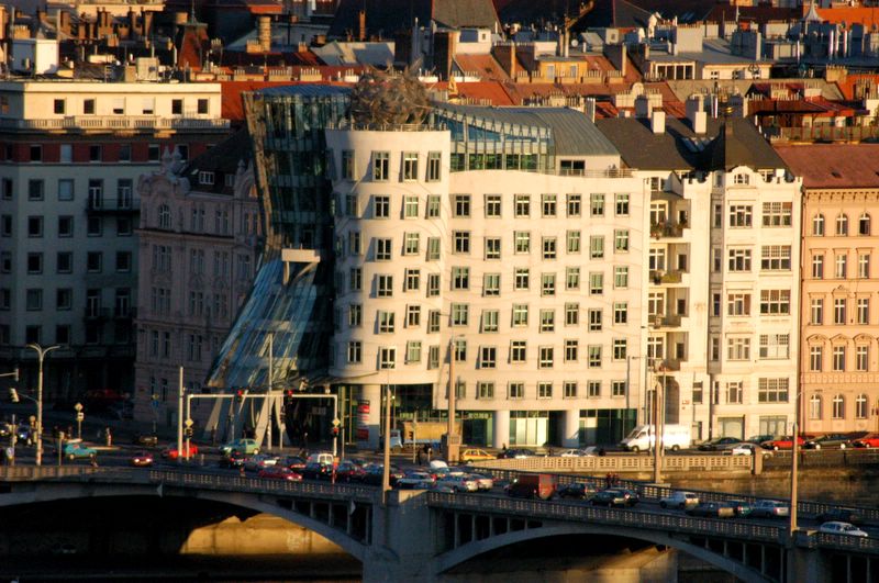 Na obali rijeke Vltave stoji skorašnja rekonstrukcija "Plesajuće zgrade"(Dancing building),udruženi trud arhitekata Milunič-a i Gehry-a i ineresantan i neobičan dodatak okruženju arhitekture Nove umjetnosti.