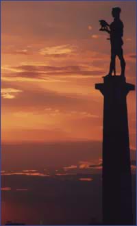 што не би требало да буде. Али највећи раскош тога неба над Београдом, то су сунчеви заласци. У јесен и у лето они су пространи и јарки као пустињске визије, а зими пригушени тмастим облацима и рујним маглама. А у свако доба године врло су чести дани кад се огањ тога сунца које залази у равници, међу рекама под Београдом, одбије чак горе у високој куполи неба, и ту се преломи и проспе као црвен сјај по разасутој вароши. Тада сунчано руменило обоји за тренутак и најзабаченије углове Београда и одблесне у прозорима и оних кућа које иначе слабо обасјава." О Београду написао: Иво Андрић, српски нобеловац |