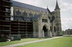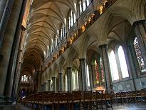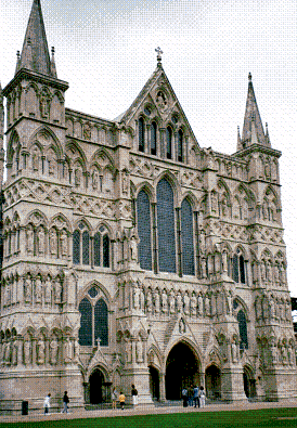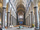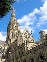 Biskup je ustanovio i temelje današnjeg Salisburyja dok se gradila katedrala. Uz kamen sa stare katedrale koristio se i tamni Purbec, fosilizirani kamen, iz južne Engleske i kamen iz kamenoloma u Ceanu, Francuska. Katedrala je vandalizirana i uništena u protestantskoj reformaciji u Engleskoj za vrijeme vladavine kralja Henrika VIII (1509.-1547.). U XVIII vijeku, engleski arhitekt James Wyatt, predložio je temeljnu rekonstrukciju za koje su vitraži i skulpture potpuno uklonjene ili pomiješane.Suzdržano ukrašena, katedrala je piramidalne kompozicije, a geometrijski oblici njenih masa kulminiraju u glasovitoj krovnoj kapi. Toranj je visok 123 metra. Tlocrt je dug i uzak s istaknutim transeptima i četvorokutnom apsidom umjesto kružne; manje kompaktan nego tlocrti francuskih crkava. Glavni brod s jednostavnim četvorodjelnim svodom visok je samo 26 metara.