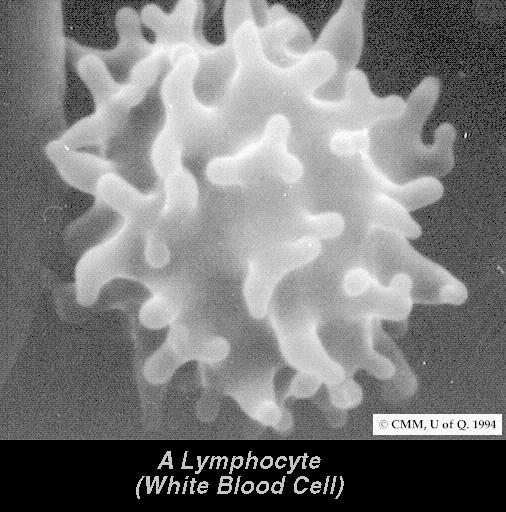 2) LIMFOCITI - ima ih oko 30%. Promjer im je oko 8-12 mikrometara. Imaju veliko okruglo jedro i oskudnu citoplazmu. One su pokretne ćelije. Funkcija limfocita je stvaranje globulina, a imaju i važnu ulogu u imunološkoj odbrani organizma jer su im antitijela pretežno gama-globulini. Stvaranje i propadanje limfocita je veoma brzo, te se čitava populacija može izmijeniti u roku od 24 sata.