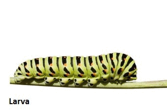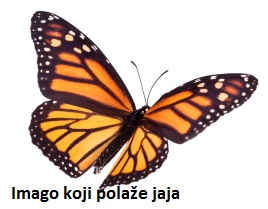 Koraci: 1. Larva 2. Larva u kokonu 3. Lutka 4. Imago 5. Imago koji polaze jaja |