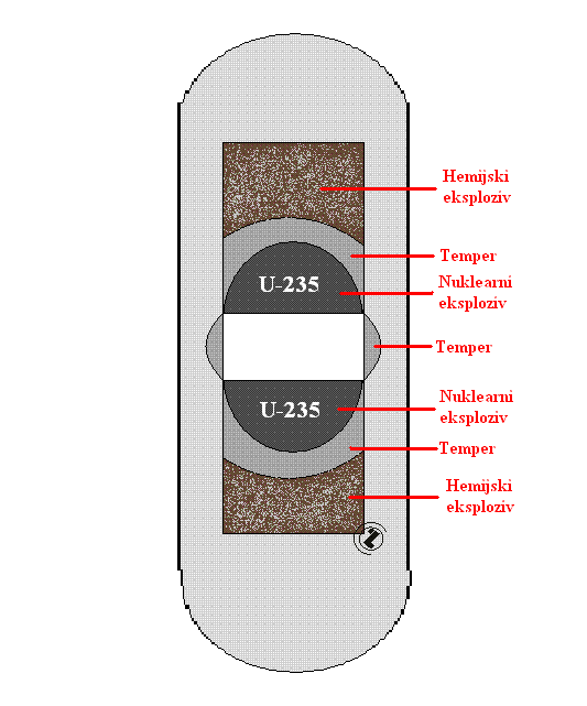 Najrazornije oružje današnjice ima prilično prost mehanizam. Dva komada uranijuma 235 koji je podložan fisiji razdvojena su. Masa svakog pojedinačnog komada manja je od tzv. kritične mase. Kritična masa je ona pri kojoj dolazi do nekontrolisane reakcije cijepanja atoma tj. fisije. Međutim spajanjem tih komada kritična masa se prevazilazi i dolazi do eksplozije. Spajanje se postiže hemijskim eksplozivom, čija je eksplozija usmjerena ka unutrašnjosti bombe, a temperi osiguravaju nešto duži kontakt uranijumskih polulopti. Da nije njih na samom početku fisione reakcije komadi bi se razdvojili uslijed početka eksplozije, koja u tom slučaju ne bi bila dovršena niti približno razorna kao što je uz njihovu pomoć.