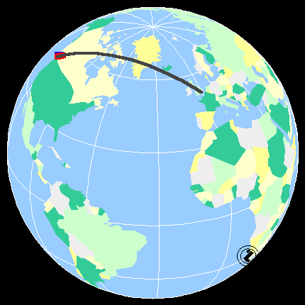 PLAVA linija predstavlja inercijalni 'veliki krug' ; CRVENA - putanja Zemljine rotacije ; CRNA - putanja u odnosu na jednu stacionarnu tačku