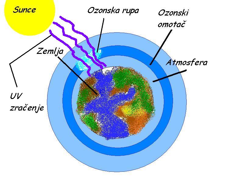 Ozonske rupe nastaju usljed šetnog djelovanja freona,odnosno gasova koje oslobađaju proizvodi u obliku sprejeva,kao što su dezodoransi,lakovi,farbe,itd.Naime,molekuli freona,tačnije hlorofluorokarbona,razbijaju molekule ozona (O3),od kojih je građen ozonski omotač,koji štiti Zemlju od štetnog UV zračenja,na molekule kiseonika (O2) i atome kiseonika (O).Na taj način nastaju rupe u ozonskom omotaču,propuštajući štetne UV zrake na Zemlju. |