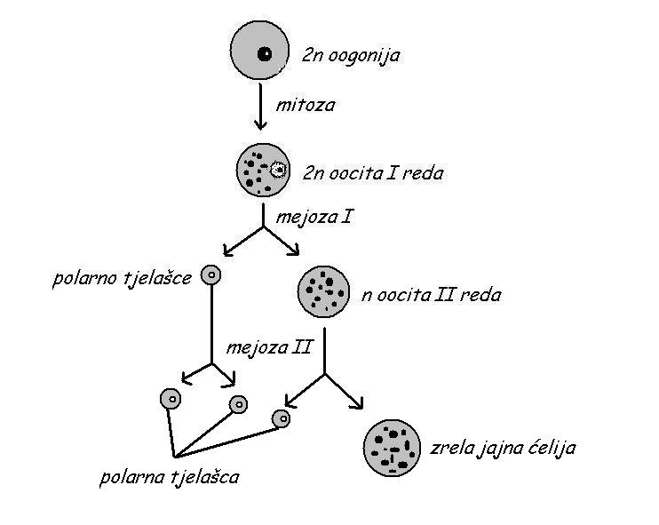 Oogeneza je proces nastanka zrelih jajnih ćelija.Oogonije,koje imaju diploidnu strukturu hromozoma ulaze u mitozu i iz njih se dobija oocita I reda,koja je,takođe 2n strukture hromozoma.Oocita I reda potom ulazi u mejozu I,koja je redukciona dioba,i iz nje se dobija jedna oocita II reda i jedno polarno tjelašce.Oocita II reda i polarno tjelašce ulaze u mejozu II i iz oocite II reda se dobija jedna zrela jajna ćelija i jedno polarno tjelašce,dok se iz polarnog tjelašca dobijaju još dva polarna tjelašca,Dakle,konačan proizvod oogeneze su jedna zrela jajna ćelija i tri polarna tjelašca koja izumiru. |