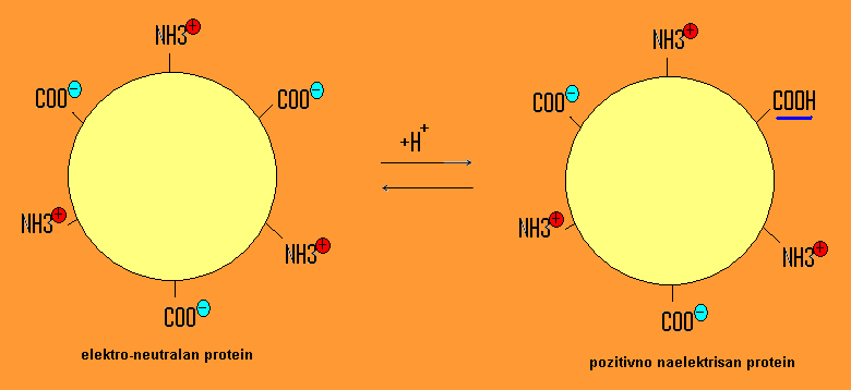 Djelovanjem vodonokovih jona (H+ jona) na elektro-neutralan protein (protein koji se nalazi u stanju zwitter jona i ne provodi struju), taj se protein pozitivno naelektrise.