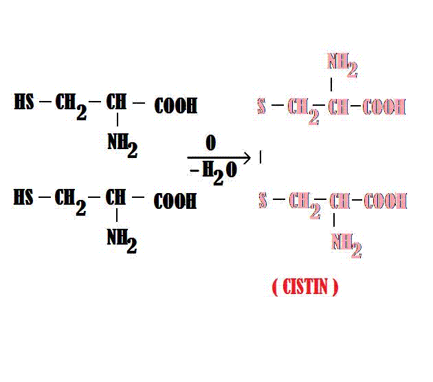 Cistein je jedna od esencijalnih amino kiselina.Oksidacija se odvija na taj nacin sto dvije molekule cisteina reaguju sa kiseonikom uz prethodno izdvajanje vode.Molekula koja nastaje naziva se CISTIN.