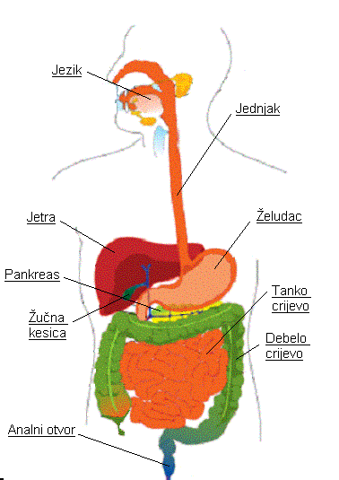 čine 1. Jezik 2. Jednjak 3. Želudac 4. Jetra 5. Pankreas i žučna kesica 6. Debelo i tanko crijevo 7. Analni otvor |
