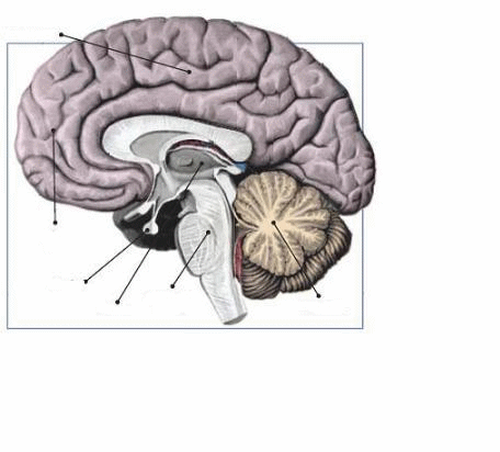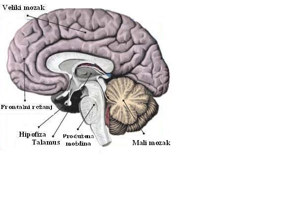 1.Veliki mozak 2.Frontalni režanj 3.Hipofiza 4.Talamus 5.Produzena moždina 6.Mali mozak |