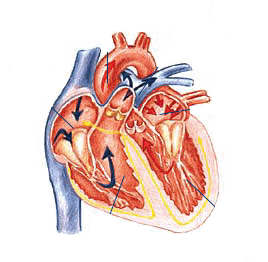 1. Gornja šuplja vena 2. Desna pretkomora 3. Desna komora 4. Plućna arterija 5. Plućne vene 6. Lijeva pretkomora 7. Lijeva komora |