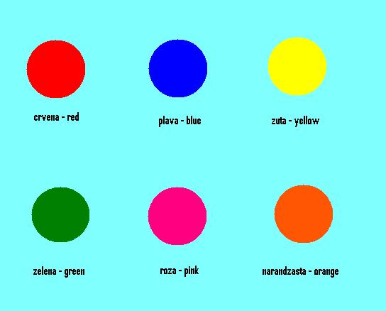 1.CRVENA - RED 2.PLAVA- BLUE 3.ŽUTA - YELLOW 4.ZELENA - GREEN 5.ROZA - PINK 6.NARANDŽASTA - ORANGE |