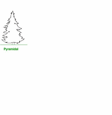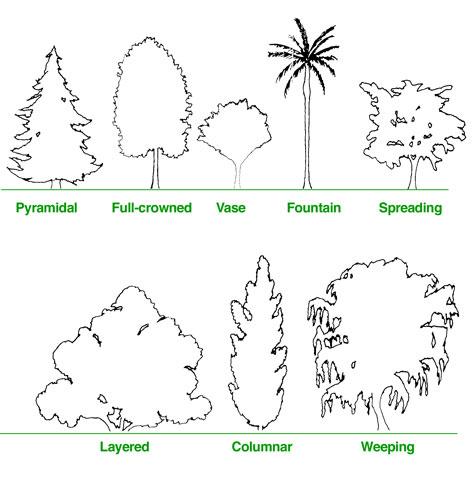 1. Pyramidal tree - Piramidalno drvo 2. Full-crowned tree - Drvo sa punom krosnjom 3. Vase tree - Drvo u obliku vazne 4. Fountain tree - Drvo u obliku fontane 5. Spreading tree - Rasireno drvo 6. Layered tree - Drvo u vise slojeva 7. Columnar tree - Drvo u obliku stuba 8. Weeping tree - Zalosna vrba