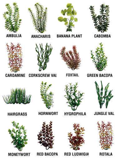 1. AMBULIA 2. ANACHARIS 3. BANANA PLANT 4. CABOMBA 5. CARDAMINE 6. CORKSCREW VAL 7. FOXTAIL 8. GREEN BACOPA 9. HAIRGRASS 10. HORNWORT 11. HYGROPHILA 12. JUNGLE VAL 13. MONEYWORT 14. RED BACOPA 15. RED LUDWIGIA 16. ROTALA |