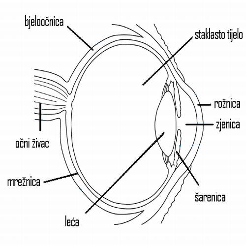 Djelovi oka su: leća šarenica zjencia rožnica staklsato tijelo bjeloočnica očni zivac mrežnica