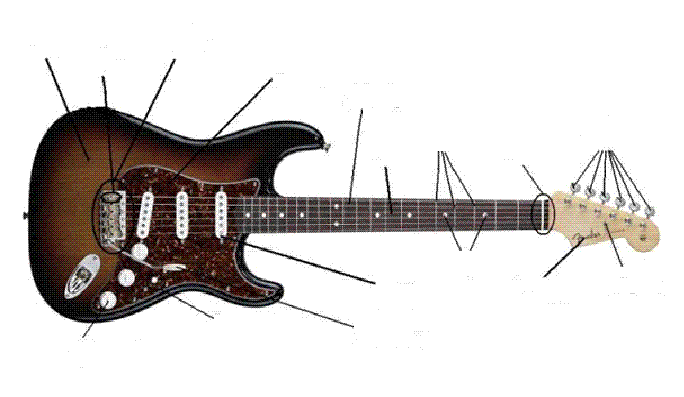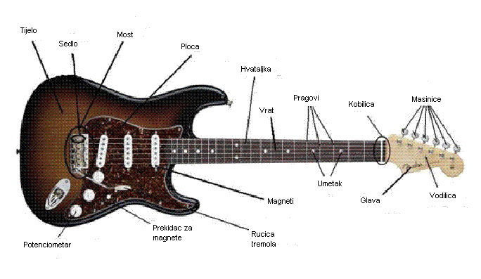 1. Potenciometar 2.Prekidac za magnete 3.Rucica tremola 4.Magneti 5.Umetak 6.Glava 7.Vodilica 8.Masinice 9.Kobilica 10.Pragovi 11.Vrat 12.Hvataljka 13.Ploca 14.Most 15.Sedlo 16.Tijelo |