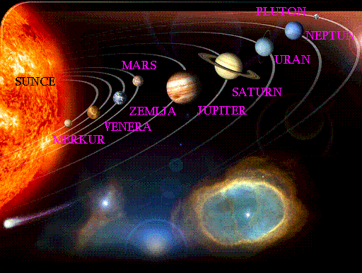 1. SUNCE 2.MERKUR 3. VENERA 4. ZEMLJA 5. MARS 6. JUPITER 7. SATURN 8. URAN 9. NEPTUN 10. PLUTON |